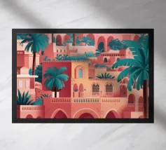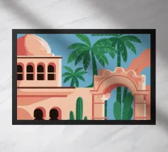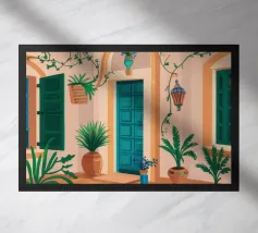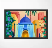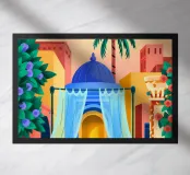 Un cortile con una struttura a cupola blu è ornato da tende fluenti e da una vegetazione lussureggiante. L'atmosfera invitante fonde l'eleganza architettonica con la tranquillità naturale.