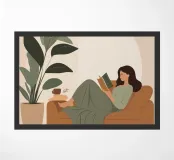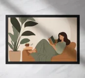 Una composizione minimalista con una donna comodamente sdraiata con un libro e una tazza di tè. La miscela di verdi e marroni tenui evoca relax, equilibrio e calore: un invito a rilassarsi e a riconnettersi con le semplici gioie della casa.