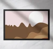Sfumature stratificate di marrone e beige creano un paesaggio stilizzato con un grande sole o una luna che sorge sullo sfondo. Le linee curve suggeriscono colline o montagne, evocando una scena desertica serena e astratta.