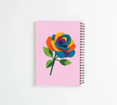 Una vibrante illustrazione astratta di una rosa con petali multicolori nei toni del blu, rosso, arancione, giallo e viola.