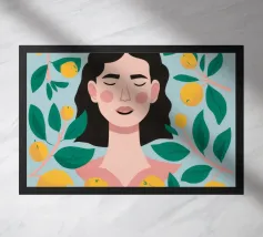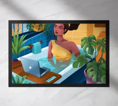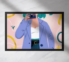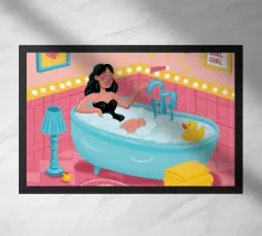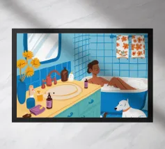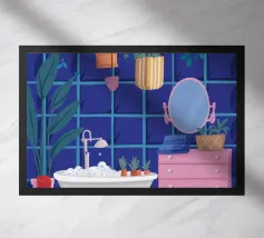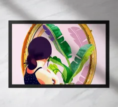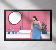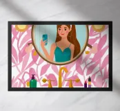 Illustrazione di una donna che guarda il suo riflesso in uno specchio ornato, circondata da vari prodotti di bellezza su un bancone del bagno. La scena è un'istantanea chic, intima ed elegante di una routine di bellezza quotidiana.