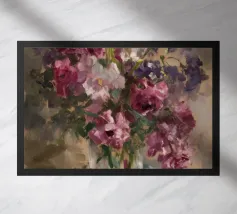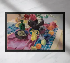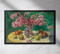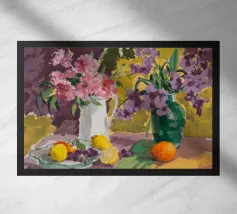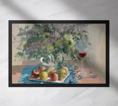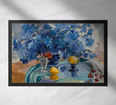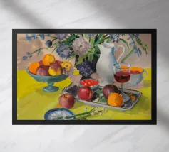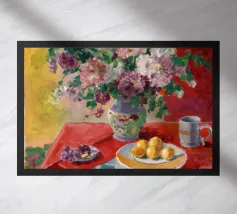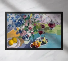 Una sontuosa natura morta presenta una teiera d'argento, una tazza di tè, una ciotola di frutta, tra cui mele e bacche, e un vivace bouquet di fiori, tutti riccamente colorati e strutturati, su un tavolo.