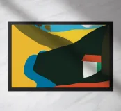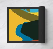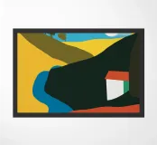 Colori vivaci dividono lo scenario in forme stilizzate che raffigurano un paesaggio collinare attraversato da un fiume blu. Una casa è adagiata all'ombra di una grande collina, con il sole brillante sospeso nel cielo.