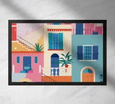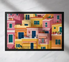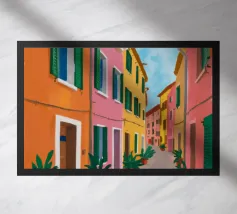 Una ripida scalinata colorata funge da strada in una città mediterranea, fiancheggiata da edifici di colore giallo, arancione e rosa, ornati da piante verdi in vaso.