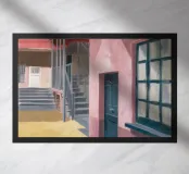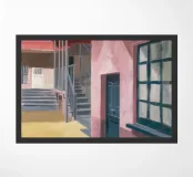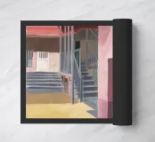 Una complessa scena urbana è resa con un'attenzione particolare alle forme geometriche e a un'audace tavolozza di colori rosa, verde acqua e rosso. Una scala esterna fornisce un forte elemento compositivo, guidando l'occhio attraverso le forme architettoniche astratte.