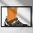 Una dichiarazione di moda moderna e stravagante catturata in un'illustrazione di un singolo sandalo nero indossato con un calzino arancione brillante. La composizione è un'interpretazione audace, giocosa e contemporanea della moda "ugly chic".