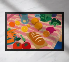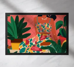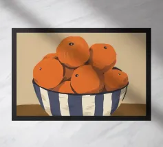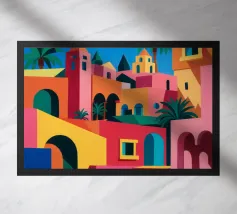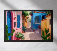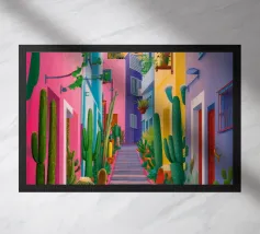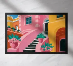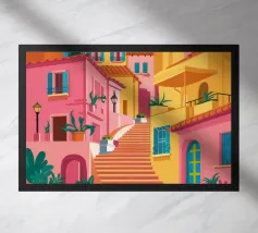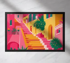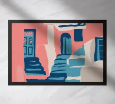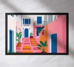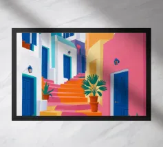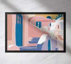 Quest'opera d'arte cattura la bellezza iconica di un'isola greca con i suoi gradini vivaci e colorati nei toni del rosa, dell'arancione e del rosso. La classica architettura bianca e blu incornicia la scena, creando un'immagine gioiosa e pittoresca che trasporta immediatamente in un vicolo soleggiato di Santorini.