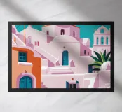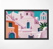 La scena pittoresca di un villaggio bianco di Santorini, con la sua classica chiesa a cupola blu, è ravvivata da fiori di bouganville rosa vibrante che si arrampicano sui muri.