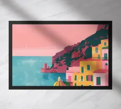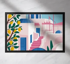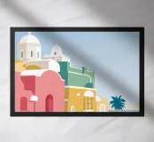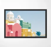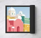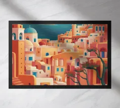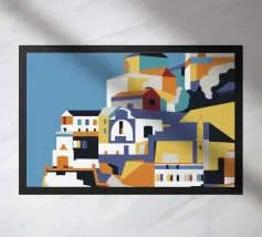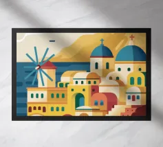 Una pittoresca illustrazione degli iconici edifici bianchi e delle cupole blu di un'isola greca, probabilmente Santorini, affacciata sul mare. La scena è una perfetta rappresentazione, inondata di sole, di un paradiso mediterraneo.