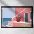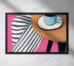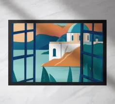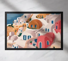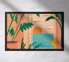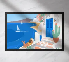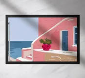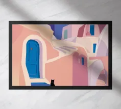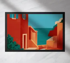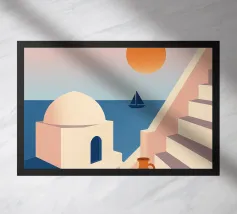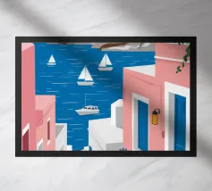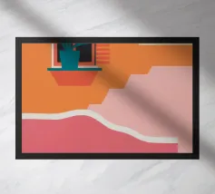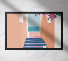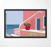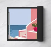 Una classica scena mediterranea che raffigura un edificio rosa con una scala che scende verso un tranquillo mare blu. Quest'opera d'arte cattura perfettamente il fascino solare e pacifico di un'isola greca.