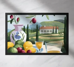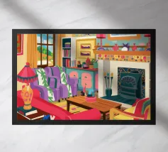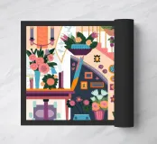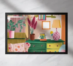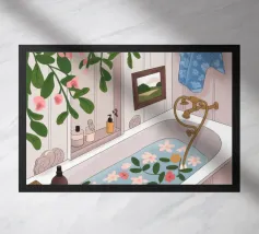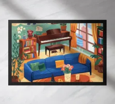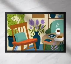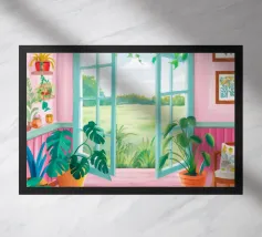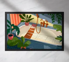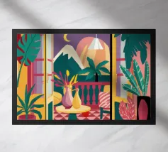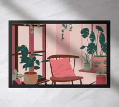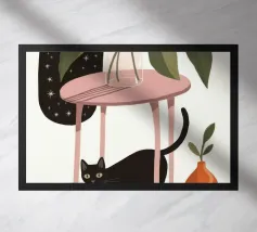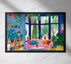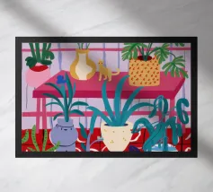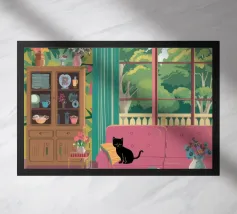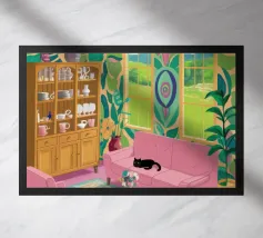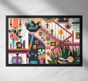 Questa opera d'arte raffigura un lussureggiante giardino interno con una scala avvolta da piante e fiori a cascata. Un gatto curioso aggiunge un tocco di allegria a questa scena tranquilla.