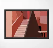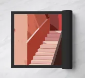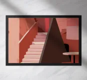Un'imponente scalinata domina uno spazio interno reso interamente in toni di rosa, salmone e terracotta, creando una scena calda, monocromatica e lunatica.
