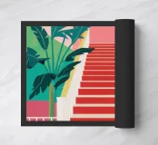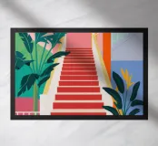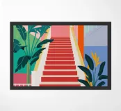 Scale rosse e vivaci conducono attraverso un edificio colorato e semplificato verso un lussureggiante ingresso ad arco, suggerendo un viaggio verso una destinazione bella ed esotica.