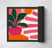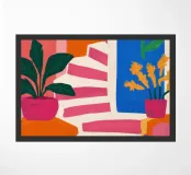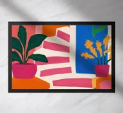 Un'illustrazione astratta mostra una scala colorata adornata da una varietà di piante in vaso, fondendo architettura e botanica in una composizione vivace e moderna.
