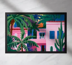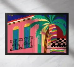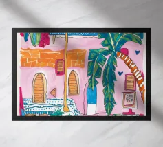 Una tranquilla scena notturna mediterranea con un affascinante edificio rosa con le tradizionali persiane verdi e un'invitante scala esterna. Le palme si stagliano su un cielo blu intenso ornato di stelle e di una luna splendente, con una singola finestra illuminata che aggiunge calore.