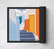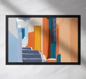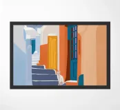 Guardando su per una stretta scala arancione e assolata verso una scheggia di cielo blu intenso e una porta, si crea una scena di viaggio calda, invitante e pittoresca.