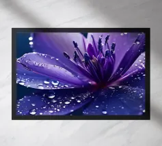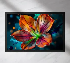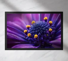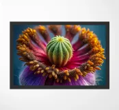 Una ripresa macro cattura i dettagli intricati di un fiore di papavero. Il fiore presenta petali viola, un centro rosso e un pistillo verde. Gli stami arancioni circondano il centro. Lo sfondo è di un blu scuro sfocato. L'immagine mette in evidenza le trame delicate e i colori vivaci del fiore.