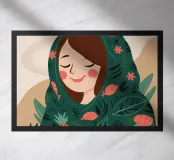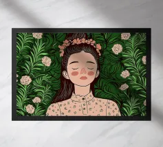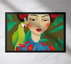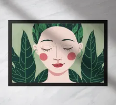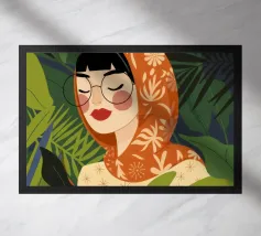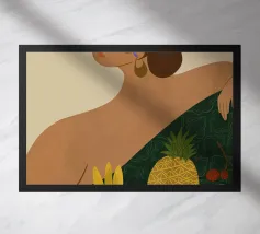Ritratto di una donna che indossa un foulard colorato, con il volto incorniciato da foglie verdi e da una stampa di ananas. La composizione è una vibrante, elegante e bellissima celebrazione della moda e della bellezza tropicale.