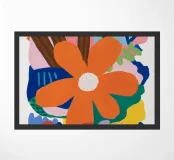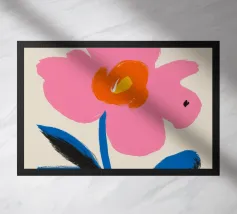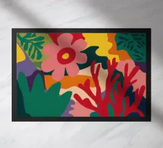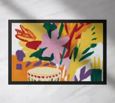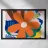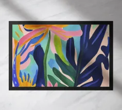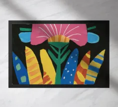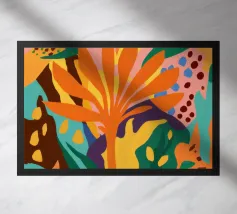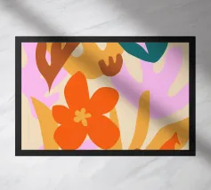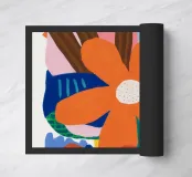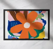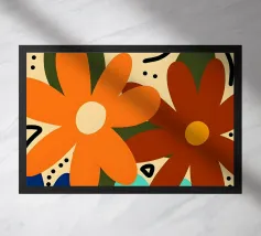 Una forma centrale arancione simile a un fiore esplode in mezzo a un turbinio di forme astratte ed elementi botanici. La composizione è dinamica ed espressiva, con steli blu, accenti rossi e uno sfondo beige strutturato, che cattura un momento di energia creativa.