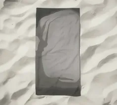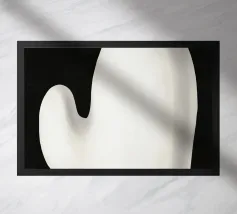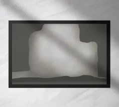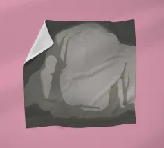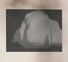 Una rappresentazione monocromatica presenta una forma accartocciata che ricorda in qualche modo una montagna o una formazione rocciosa. Le ombre e le lumeggiature sono state utilizzate per dare alla forma un aspetto tridimensionale, e poggia su uno sfondo più scuro che ne esalta la silhouette.