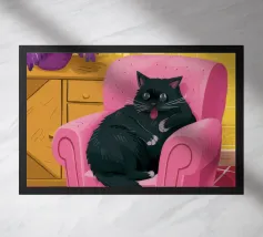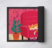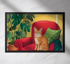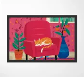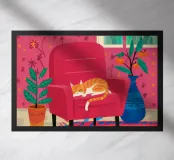 Primo piano di un gatto che dorme pacificamente su una poltrona rossa e vivace. La scena è semplice e commovente, incentrata sul comfort e sulla tranquillità del riposo di un animale domestico in un ambiente colorato e moderno.