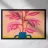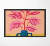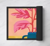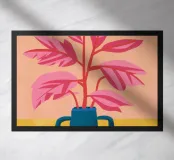 Un'illustrazione semplice ma d'effetto di una pianta dalle foglie rosa in un audace vaso blu su uno sfondo caldo, che celebra la bellezza del colore e della forma botanica minimalista.