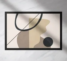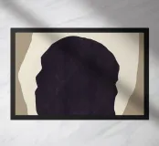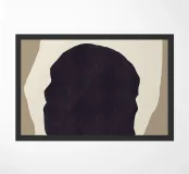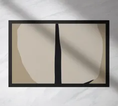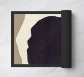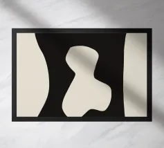 Una grande forma nera irregolare è posizionata al centro su uno sfondo più chiaro a contrasto, dall'aspetto ruvido e strappato. Il design è minimalista, con un'atmosfera astratta e una tavolozza di colori semplice.