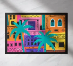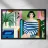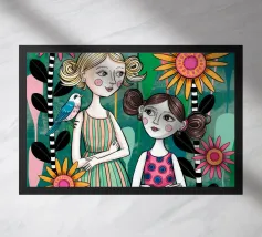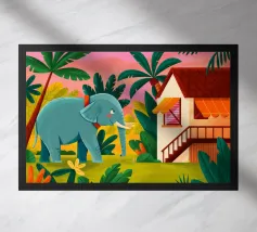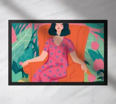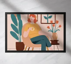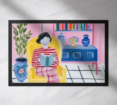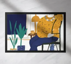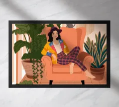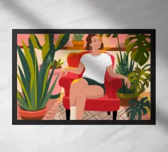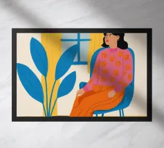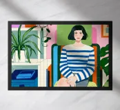 Questa opera d'arte raffigura una persona seduta in una stanza colorata che indossa abiti a righe. Lo sfondo comprende varie piante e mobili, creando un ambiente accogliente e sereno.