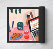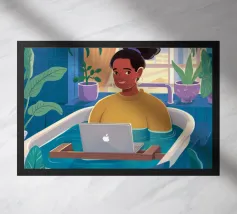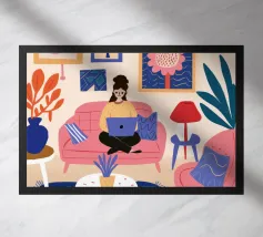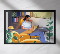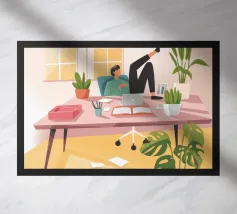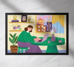 Una persona lavora al computer portatile circondata da libri, carte ed elementi decorativi. Le piante e l'ambiente caldo migliorano l'ambiente produttivo.