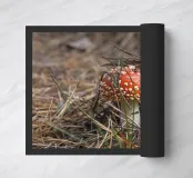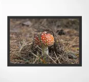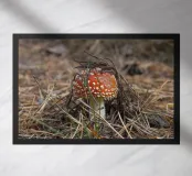 Una piccola mosca agarica fa capolino dal suolo della foresta, emergendo da una coltre di aghi di pino: la sorpresa silenziosa della natura.