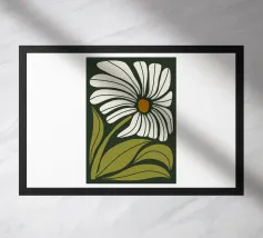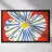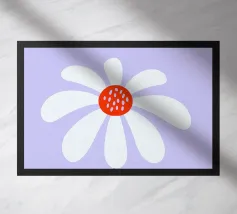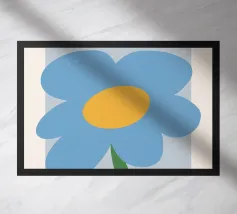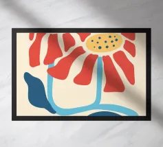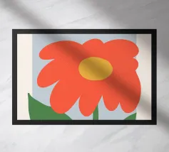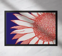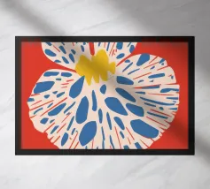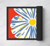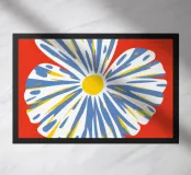 Un'illustrazione audace e grafica di un singolo grande fiore, probabilmente un anemone, con petali a strisce bianche e blu e un centro giallo. Lo sfondo rosso brillante rende il fiore il fulcro assoluto di questo pezzo potente.