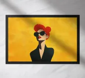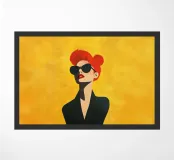 A modern, minimalist illustration of a confident woman with striking red hair, black sunglasses, and a sleek black outfit set against a textured yellow background. The bold, graphic style evokes sophistication and retro charm.