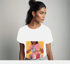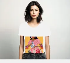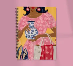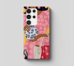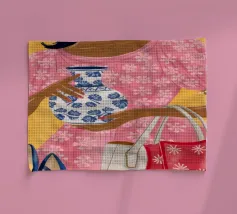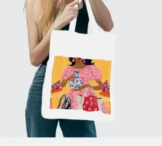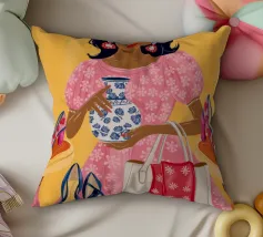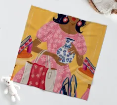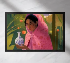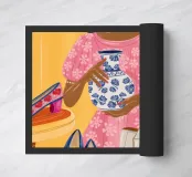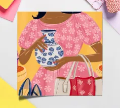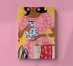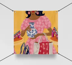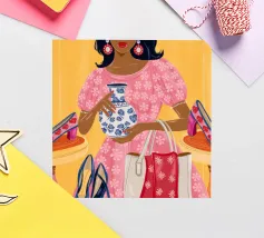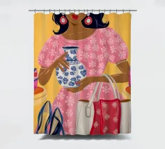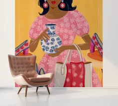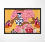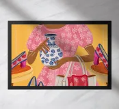 This painting showcases a person in a pink dress holding a vase and a handbag, surrounded by shelves with colorful items in a boutique. The scene highlights elegance and modernity.