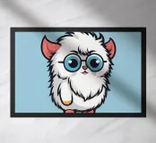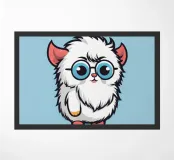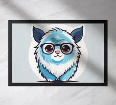 Un'affascinante creatura di peluche si erge in piedi con occhiali blu oversize, mostrando una miscela di elementi giocosi e design stravaganti, su uno sfondo azzurro morbido.
