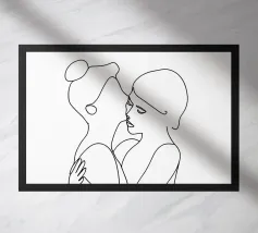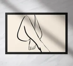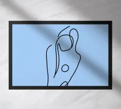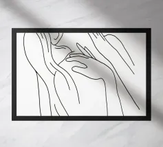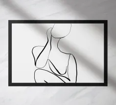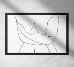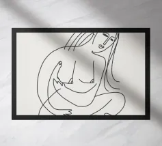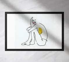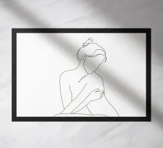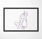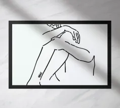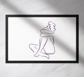 Un semplice disegno al tratto raffigura una persona seduta con i capelli ricci, le braccia avvolte intorno alle ginocchia. Lo stile minimalista utilizza linee morbide e fluide per trasmettere un senso di calma e introspezione.