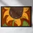 Un girasole stilizzato presenta petali giallo caldo e un centro marrone, su uno sfondo rosso ruggine. Lo stelo e le foglie verdi sono rappresentati con linee semplici e fluide.