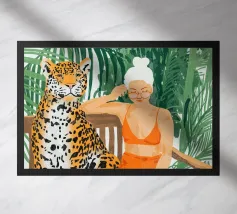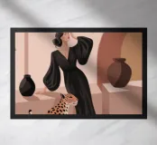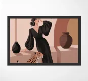 Questa opera d'arte ritrae una persona in abito nero che assume una posa composta accanto a un leopardo. La scena emana raffinatezza, sicurezza e arte senza tempo.