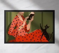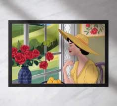 Questa opera d'arte raffigura una persona con capelli corti e biondi che indossa una giacca floreale e tiene in mano un libro. Lo sfondo giallo brillante ne esalta l'essenza chic ed elegante.