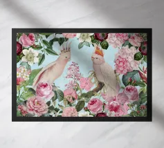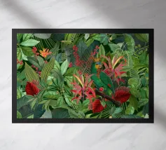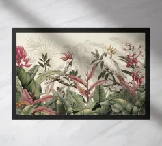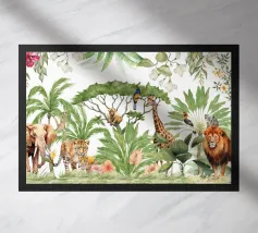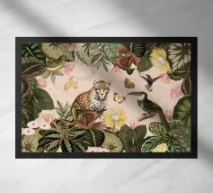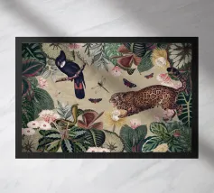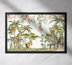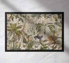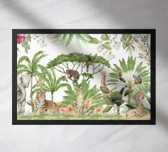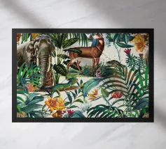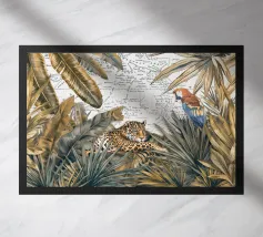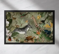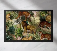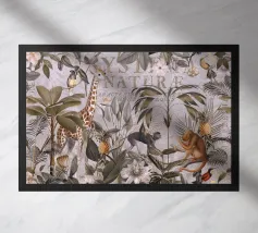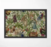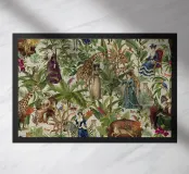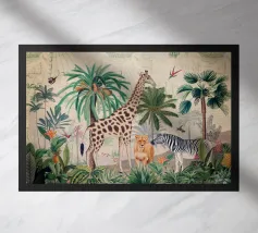 Questo incantevole disegno unisce l'eleganza vittoriana alla fantasia tropicale in una scena meravigliosamente stravagante. Graziose signore in ornati abiti d'epoca si aggirano in paesaggi lussureggianti pieni di palme e fiori esotici, interagendo giocosamente con mansueti animali selvatici. Alcune cavalcano zebre con composta dignità, altre si rilassano su divani barocchi accanto a sereni ghepardi, mentre alcune offrono dolcetti a gentili giraffe. La composizione è ricca di dettagli e deliziosamente surreale, creando un mondo vivace e pieno di affascinanti sorprese che si rivelano più a lungo si guarda.