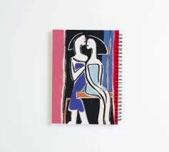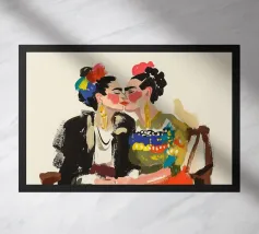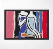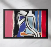 Due figure stilizzate sono ritratte a stretto contatto, condividendo quello che sembra essere un momento di intimità. L'uso di colori vivaci e forme semplici conferisce all'immagine un'atmosfera moderna e astratta.