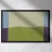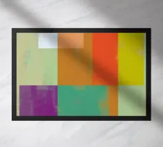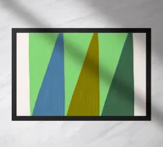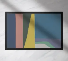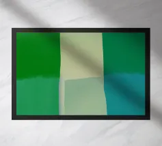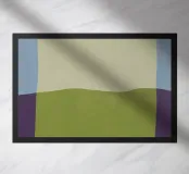 Domina uno stile minimalista con ampie fasce di colore blu, verde e viola, separate da linee rette per creare una composizione segmentata. L'elemento centrale ricorda un paesaggio stilizzato con un primo piano, un orizzonte e un cielo semplificati.