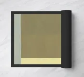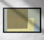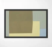 Diverse forme geometriche dai colori tenui sono sovrapposte a uno sfondo chiaro. Un rettangolo color oliva opaco domina una parte della tela, sovrapponendosi parzialmente a una forma giallo pallido, con un accenno di blu che fa capolino da sotto.