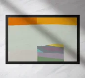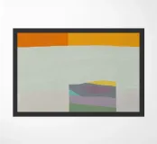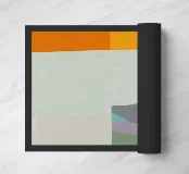 La composizione è dominata da audaci blocchi di colore, con un'enfasi sull'arancione e sul verde nella parte superiore e uno sfondo chiaro più tenue. Un rettangolo più piccolo con un disegno multicolore e stratificato è centrato sullo sfondo chiaro, creando un contrasto sorprendente.