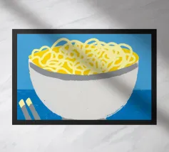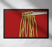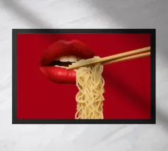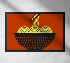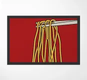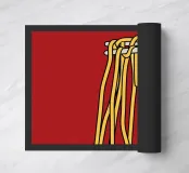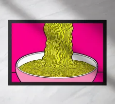 Audace e giocosa, questa illustrazione grafica pop art presenta spaghetti giallo brillante sollevati da bacchette su uno sfondo rosso vibrante: un'eccentrica celebrazione del divertimento, del cibo e del colore.
