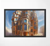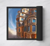 Una struttura architettonica surreale con caratteristiche curve e distorte, che fonde stili classici e moderni, si erge sotto un cielo blu brillante. La strada di ciottoli e la luce soffusa del sole esaltano l'atmosfera stravagante e onirica.