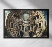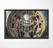 Una struttura architettonica circolare mozzafiato con archi intricati, colonne e una grande scalinata emana eleganza e simmetria. Gli accenti di verde lussureggiante e il cielo drammatico esaltano l'atmosfera artistica e surreale di questo design unico.