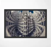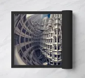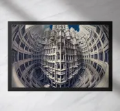Una prospettiva fisheye surreale che mostra una torreggiante architettura gotica futuristica con dettagli intricati e motivi simmetrici, sullo sfondo di un cielo blu vibrante con nuvole drammatiche. L'immagine evoca la modernità mescolata a elementi di design classico.