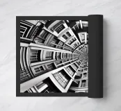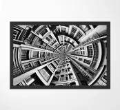 Una suggestiva rappresentazione fisheye in bianco e nero di un'architettura urbana simmetrica con finestre stratificate, facciate curve e dettagli intricati. La composizione a spirale crea profondità, armonia e un'estetica surreale e futuristica.