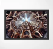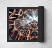 Una surreale rappresentazione fisheye di un'architettura gotica ornata da archi intricati, guglie svettanti e modelli simmetrici che convergono sotto un cielo blu vibrante. L'artigianato dettagliato crea un senso di grandezza e maestria architettonica.