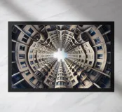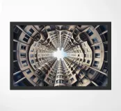 Una vista fisheye di un edificio cilindrico che mostra balconi curvi, architettura simmetrica e torri verticali che convergono verso un luminoso cielo centrale. L'intricato design enfatizza la moderna innovazione urbana e l'armonia strutturale.